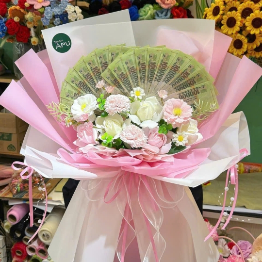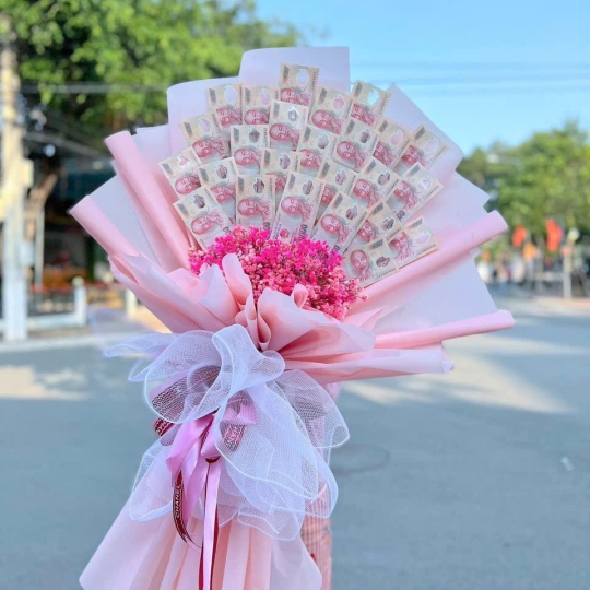 Sản phẩm bó hoa tiền được thiết kế từ những tờ tiền thật, khéo léo gấp và sắp xếp thành hình hoa hoặc kết hợp cùng hoa tươi để tạo nên tổng thể hài hòa, sang trọng. Tùy theo nhu cầu, khách hàng có thể lựa chọn mệnh giá tiền, số lượng cũng như kiểu dáng bó hoa phù hợp với ngân sách. Chính sự linh hoạt này giúp bó hoa tiền trở thành món quà “cá nhân hóa”, mang dấu ấn riêng biệt cho từng người nhận.