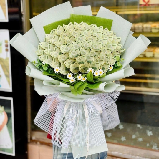 Sản phẩm bó hoa tiền được thiết kế từ những tờ tiền thật, khéo léo gấp và sắp xếp thành hình hoa hoặc kết hợp cùng hoa tươi để tạo nên tổng thể hài hòa, sang trọng. Tùy theo nhu cầu, khách hàng có thể lựa chọn mệnh giá tiền, số lượng cũng như kiểu dáng bó hoa phù hợp với ngân sách. Chính sự linh hoạt này giúp bó hoa tiền trở thành món quà “cá nhân hóa”, mang dấu ấn riêng biệt cho từng người nhận.