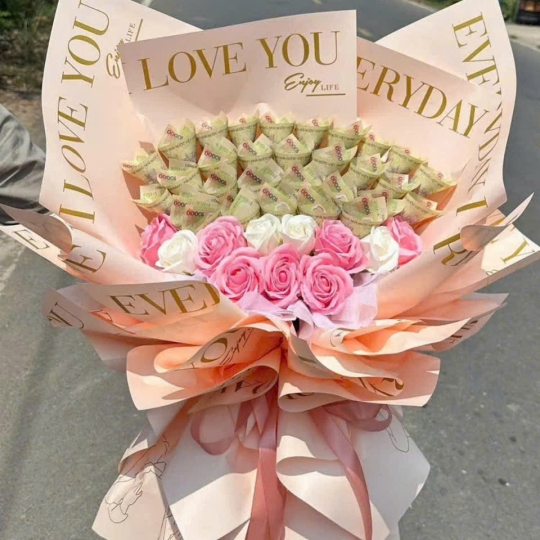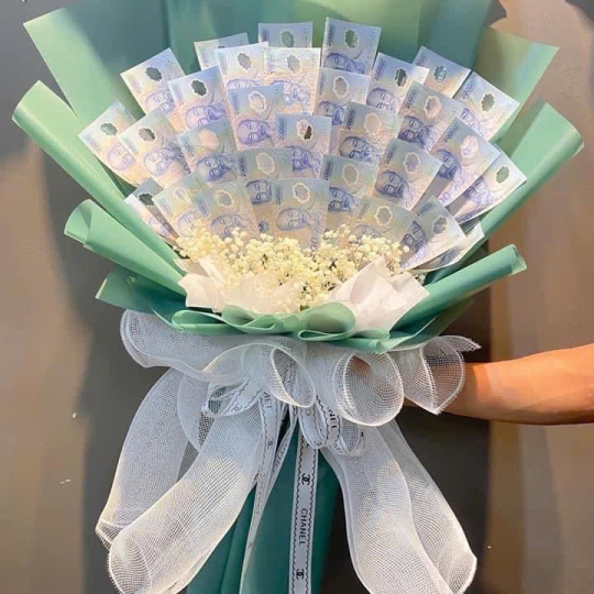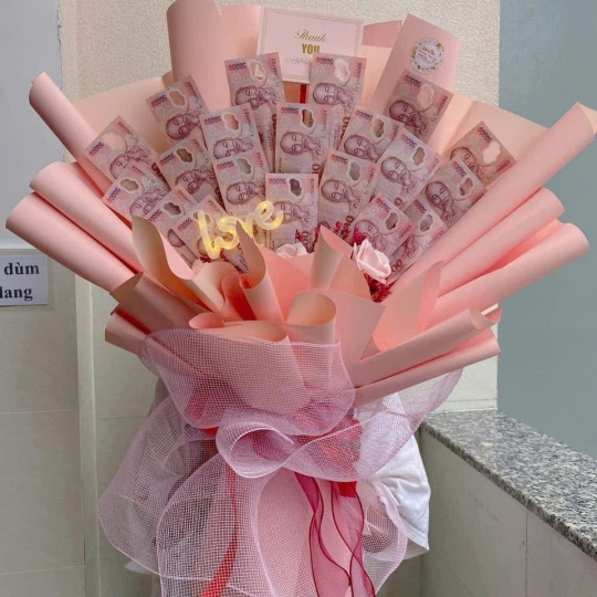 Sản phẩm bó hoa tiền được thiết kế từ những tờ tiền thật, khéo léo gấp và sắp xếp thành hình hoa hoặc kết hợp cùng hoa tươi để tạo nên tổng thể hài hòa, sang trọng. Tùy theo nhu cầu, khách hàng có thể lựa chọn mệnh giá tiền, số lượng cũng như kiểu dáng bó hoa phù hợp với ngân sách. Chính sự linh hoạt này giúp bó hoa tiền trở thành món quà “cá nhân hóa”, mang dấu ấn riêng biệt cho từng người nhận.